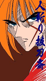 すべて単色でできています。これは抜刀斎の非情の一面を出そうとして、わざとそうしたんです。試みが成功しているとよいのですが、失敗なら単なる手抜きです(^-^; わかると思いますが、壁紙用のイラストなんです。あ、全部そうか。 使用:単行本、MS Paint、Super Kid1.0 |