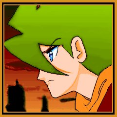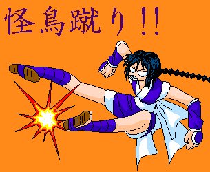 「るろうに剣心」から、元気バクハツ娘・巻町操ちゃんです。なんといいますか、ふともも…じゃなくて元気いっぱいですね。 冗談はともかく、一応この背景色は、カラー対比のチャートを参考にして選んだんですよ。「活動的な」というイメージで。それ以外にはとくにありません。腕とか顔とか手抜きですね…。 使用:単行本、MS Paint、Super Kid1.0 |